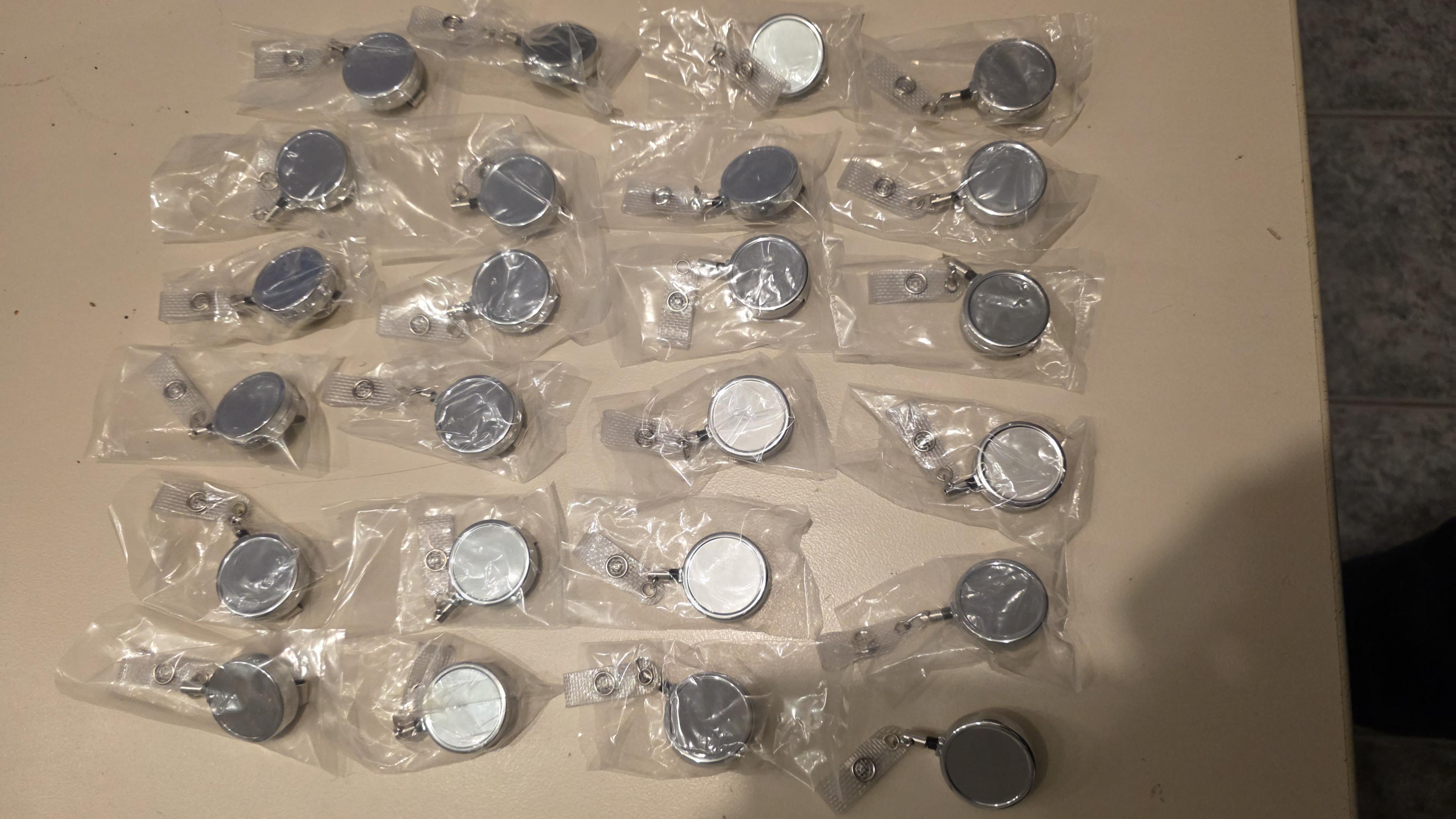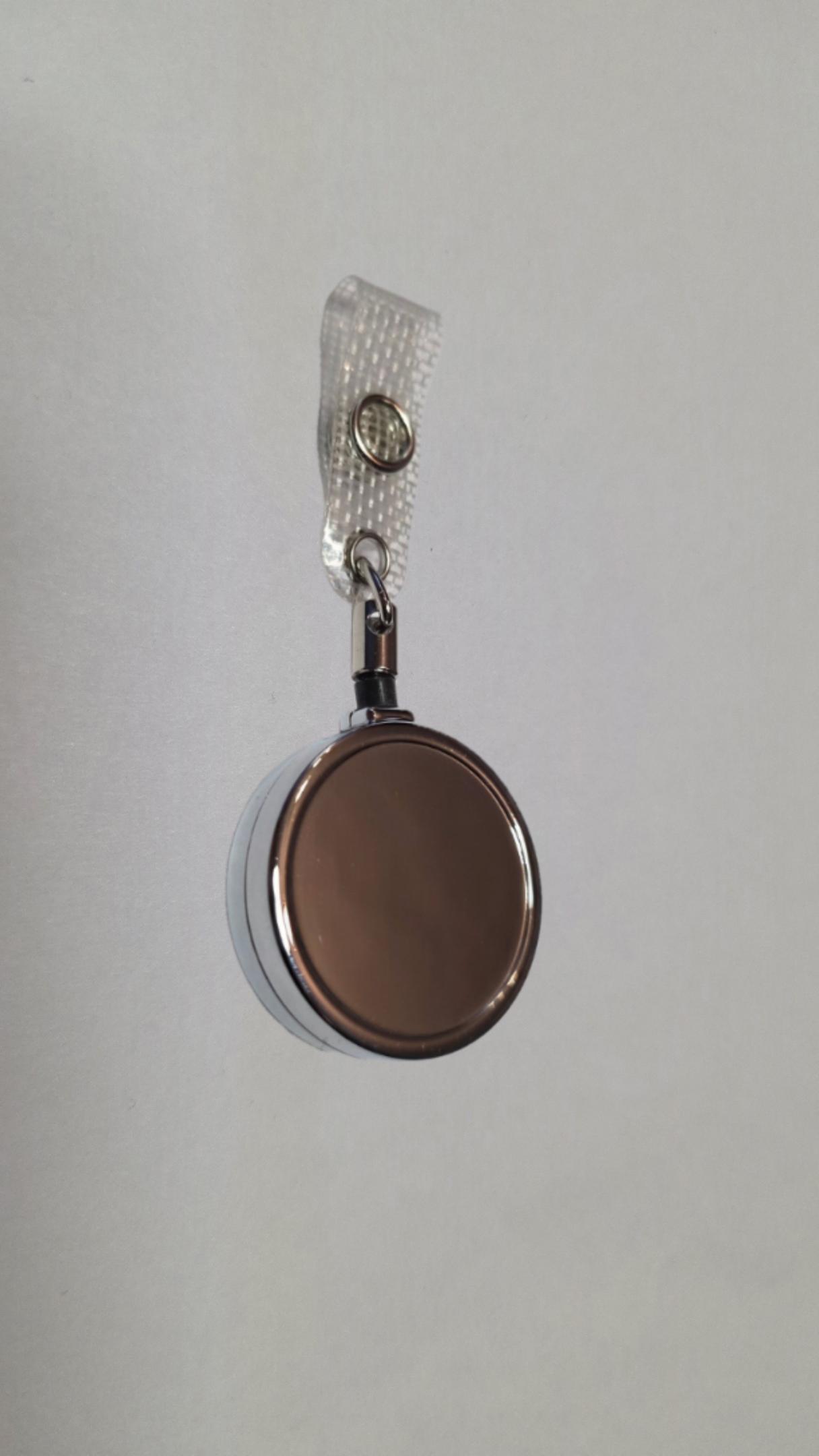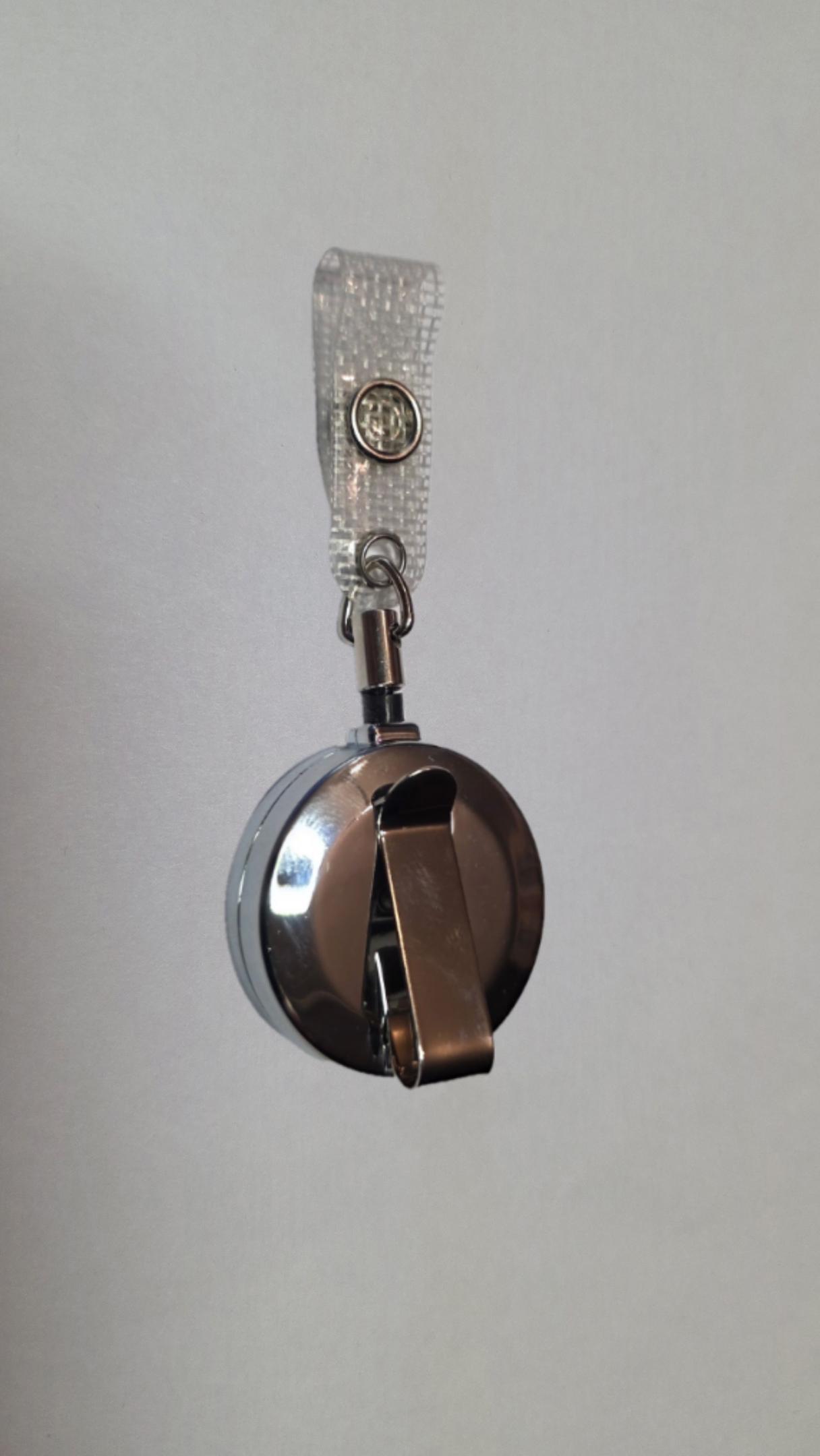 24 Stück. Runder Ausweishalter aus Metall, mit Gürtelclip, Rücklaufdämpfer und Lasche.